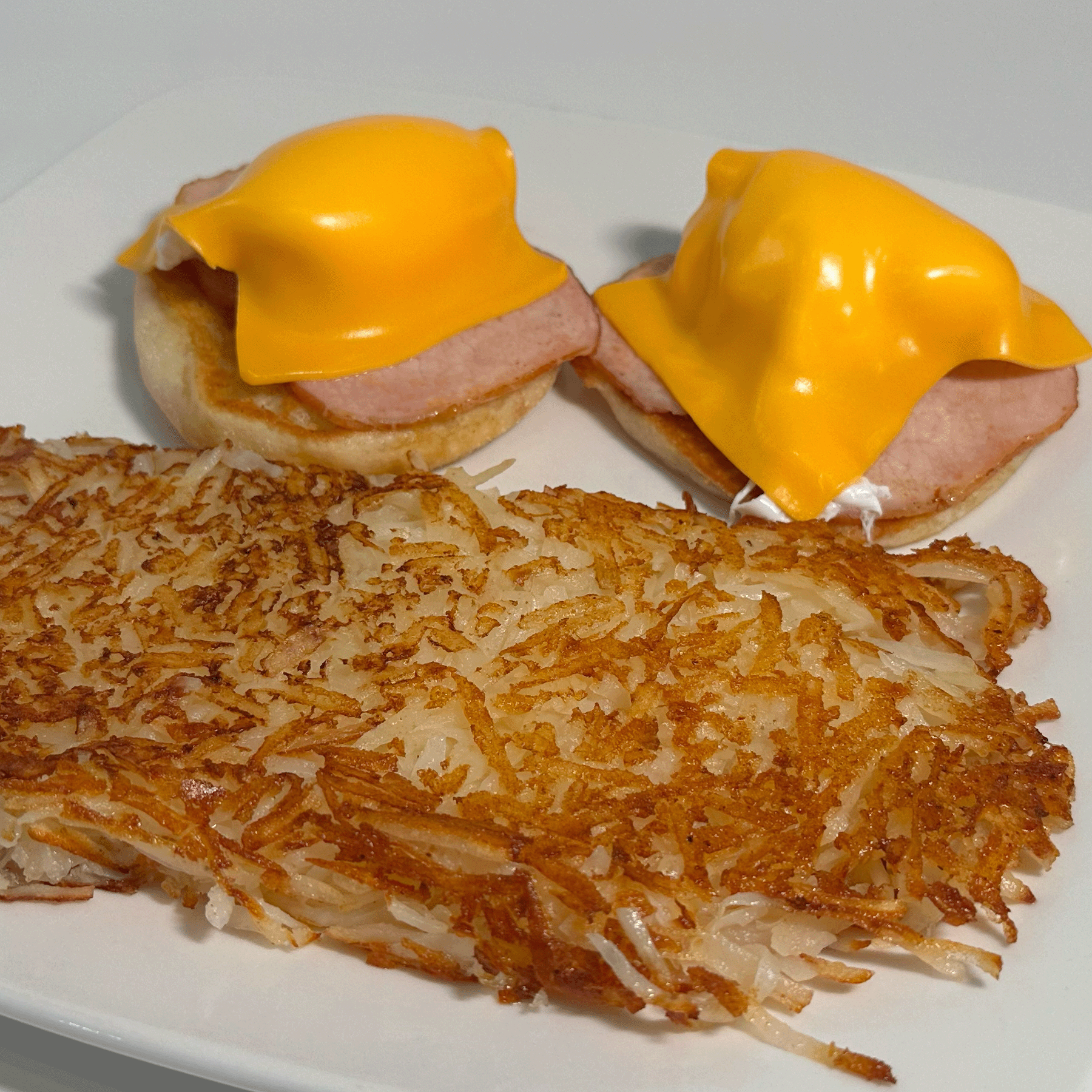 Poached eggs on English Muffin served with Canadian bacon and cheese.