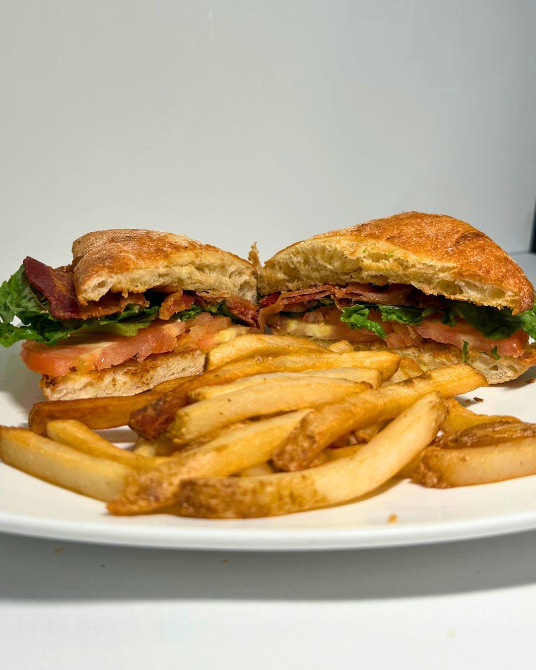 Crispy bacon, lettuce and tomatoes served on toasted ciabatta.