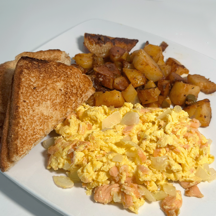 Cheesy and hearty three cheese omelet, served with toast + side.