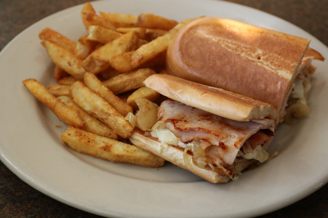 Sliced deli turkey with bacon, melted Swiss and sauteed onions.